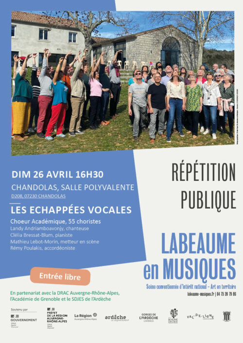 Labeaume en Musiques vous propose une répétition publique des « Échappées Vocales » (Chœur Académique de 55 choristes) le dimanche 26 avril 2026, à 16h30, à la […]