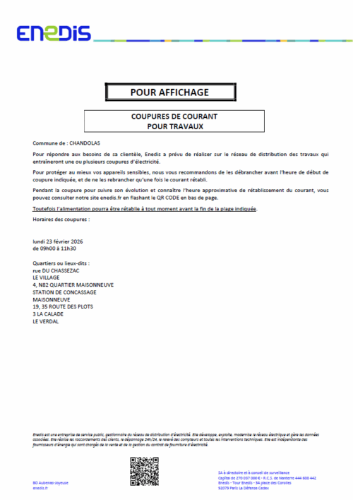 « Pour répondre aux besoins de sa clientèle, Enedis a prévu de réaliser sur le réseau de distribution des travaux qui entraîneront une ou plusieurs coupures d’électricité.