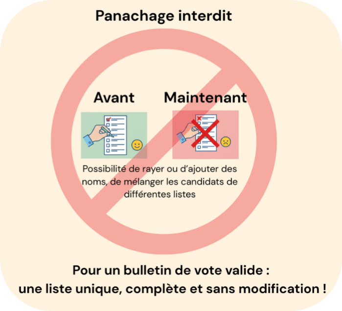 Cela signifie qu’un électeur ne pourra plus rayer ou ajouter de noms sur le bulletin de vote, sous peine de le rendre nul et donc non « comptabilisé » en faveur d’une liste au moment du dépouillement.