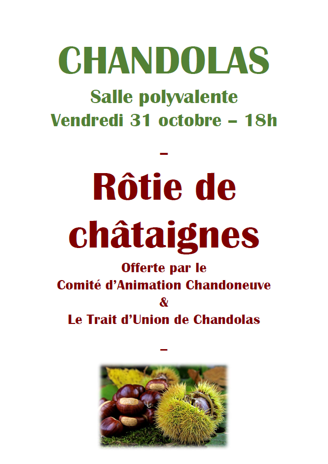 Le comité d’animation Chandoneuve ainsi que le Trait d’Union (Aînés Ruraux) convient les Chandolassiens et Chandolassiennes à leur traditionnelle castagnade, le vendredi 31 octobre 2025 à 18h, à la salle polyvalente du Verdal !
