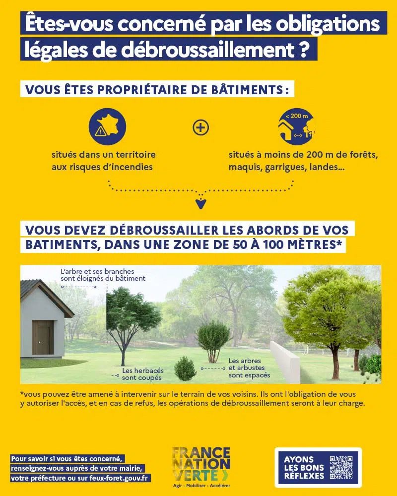Le débroussaillement consiste sur une profondeur d’au moins 50 mètres autour de son habitation, à réduire la quantité de végétaux et à créer des discontinuités dans la végétation restante. Ce n’est ni une coupe rase, ni un défrichement. Il s’agit de couper la végétation herbacée, les buissons et les arbustes, et selon votre département de mettre à distance les arbres pour qu’ils ne se touchent pas.
