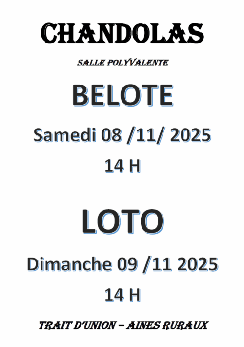Les Aînés Ruraux de Chandolas vous invitent à venir participer aux évènements qu’ils organisent le week-end des 8 et 9 novembre, à la salle polyvalente […]