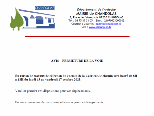 Le comité d’animation Chandoneuve ainsi que le Trait d’Union (Aînés Ruraux) convient les Chandolassiens et Chandolassiennes à leur traditionnelle castagnade, le vendredi 31 octobre 2025 […]