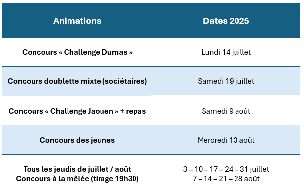 Programme estival de La Rabale Actualités3 juillet 20251 juillet 2025 Les concours de pétanque à la mêlée des jeudis de juillet et d’août débutent ce 3 juillet !Suite à une modification de date pour le Challenge Jaouen, voici ci-dessous le calendrier des animations estivales mis à jour :